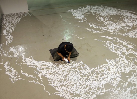 After his sister’s death to brain cancer over a decade ago, Yamamoto adopted salt as his primary medium. Following the symbolism in Japanese culture, salt is a symbol of purification, as well as a necessary element for human life. The artist uses loose salt to create intricate labyrinths directly onto gallery floors, or in baked brick form to create larger interior structures. As the labyrinth pattern would suggest, Yamamoto views his work as a path through his grieving process. Although the creation of these impermanent designs is seemingly futile, he considers them exercises necessary to his healing.